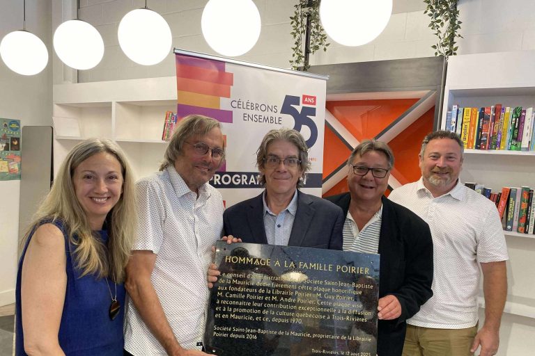 Toujours ce matin, une plaque commémorative a été dévoilée en l’honneur des fondateurs Guy et Camille Poirier, en présence d’André Poirier. Le fils de Guy a été propriétaire de la Librairie Poirier jusqu’en 2016, lorsqu’il a remis l’établissement entre les mains de la Société Saint-Jean-Baptiste de la Mauricie.
