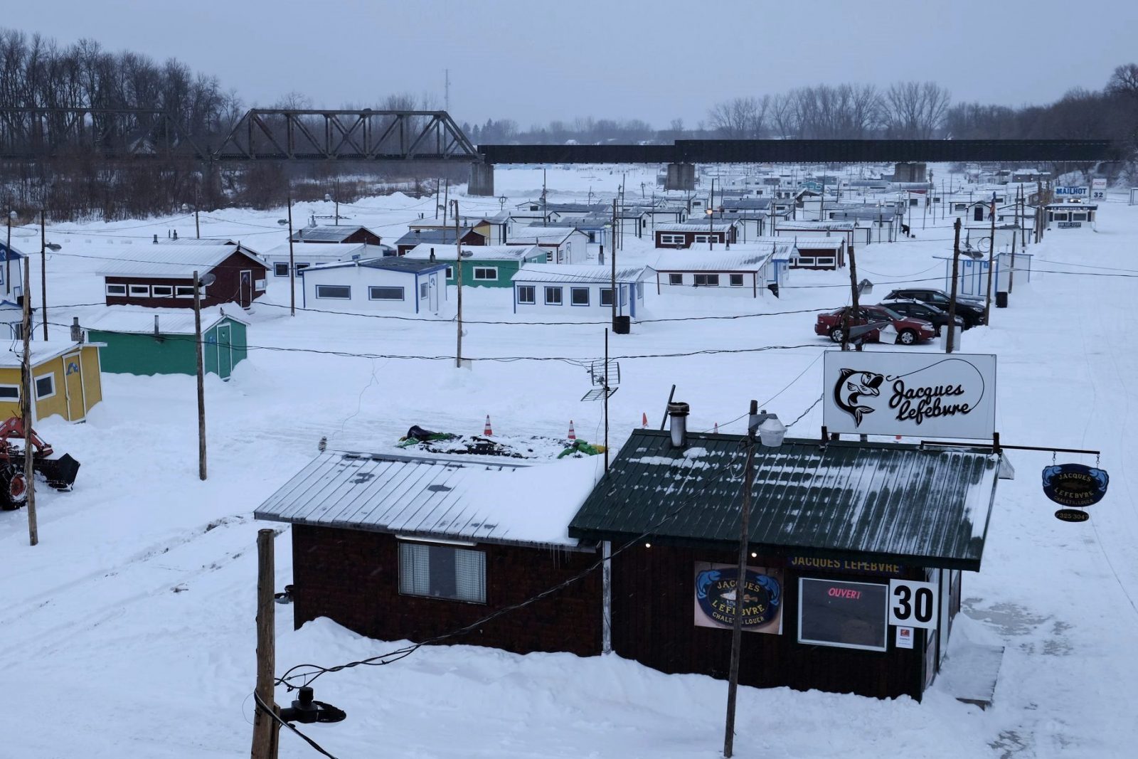 La rivière Sainte-Anne est presque entièrement gelée sur toute sa superficie. Le couvert de glace est d’environ six à huit pouces, mais le couvert de glace doit être de 12 pouces pour permettre l’installation du village de pêche sur la rivière.